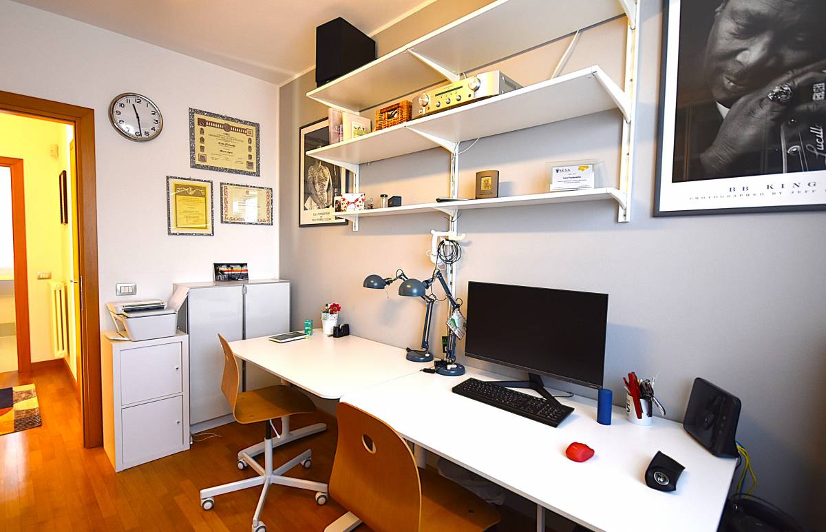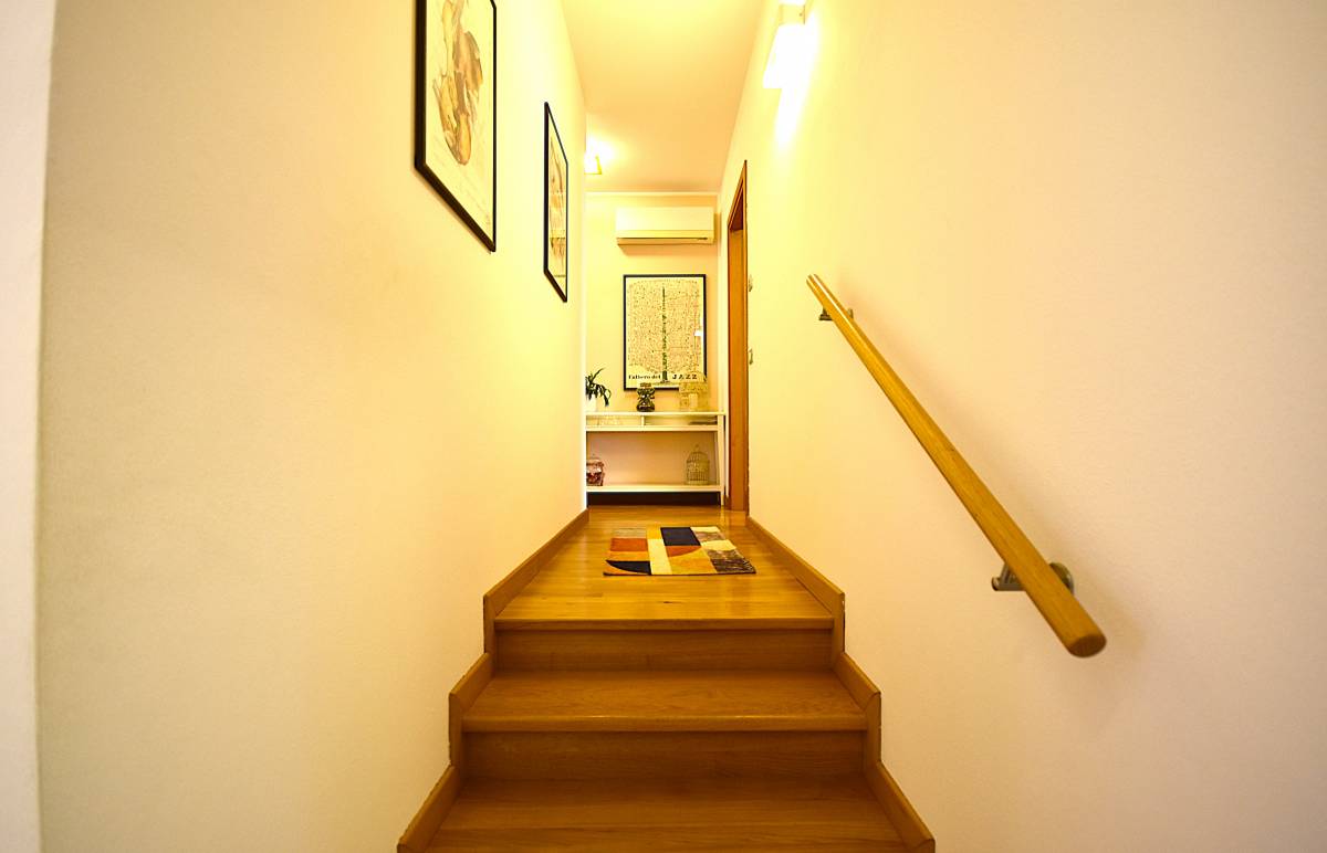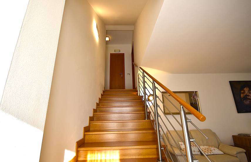 Attraverso una splendida scala, ben rifinita e dal forte impatto estetico, si raggiunge il piano superiore, dove il calore del pavimento in legno crea immediatamente un’atmosfera accogliente. Qui sono presenti uno studio luminoso, ideale come angolo lavoro o stanza hobby, un bagno finestrato, una camera da letto con balcone, e un’ulteriore stanza, attualmente allestita come un confortevole salottino privato. Da questo ambiente si accede a una grande terrazza, perfetta come spazio relax, area lettura o per piacevoli momenti all’aperto durante le belle stagioni.