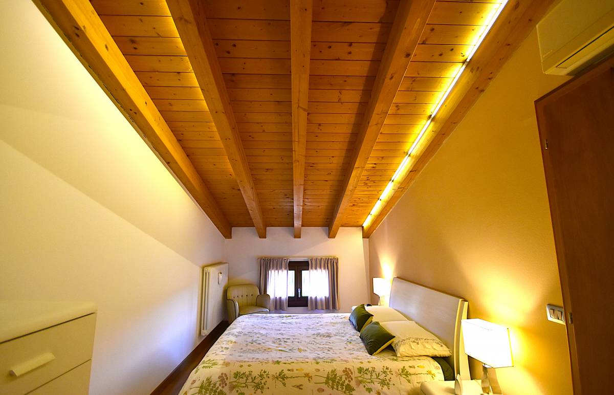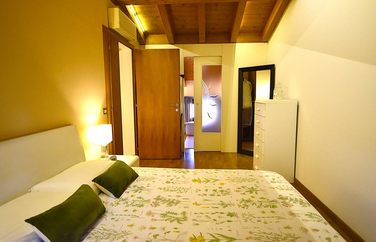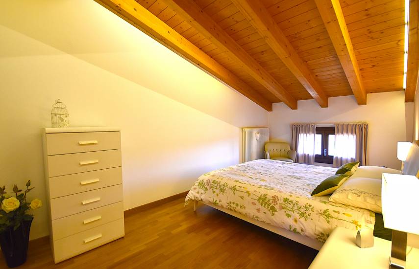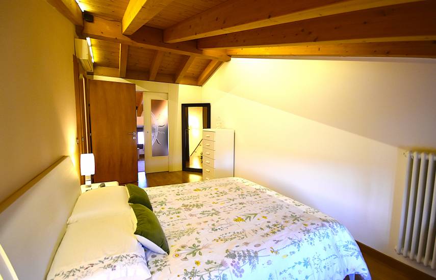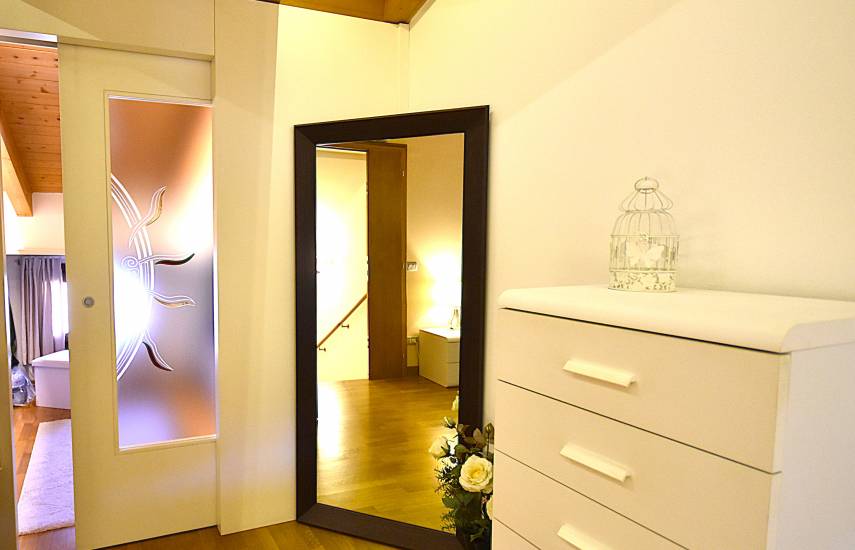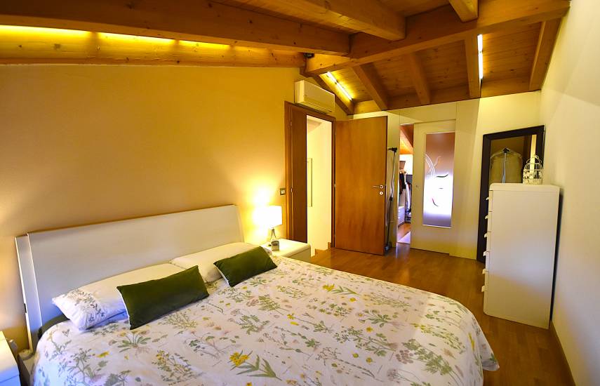 Proseguendo la salita, si raggiunge la mansarda, un ambiente davvero affascinante: le travi a vista, esposte e mantenute con cura, e le moderne luci LED che ne esaltano le linee creano un’atmosfera raffinata e accogliente. La mansarda è stata trasformata in una splendida camera matrimoniale, arricchita da una cabina armadio su misura, spaziosa e ben organizzata, perfetta per chi desidera comfort e funzionalità.
