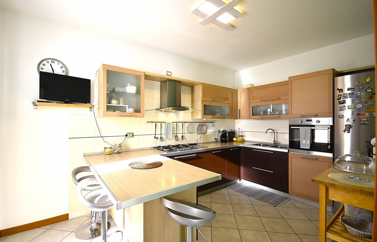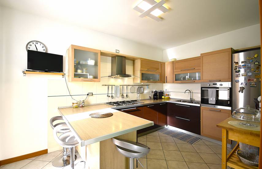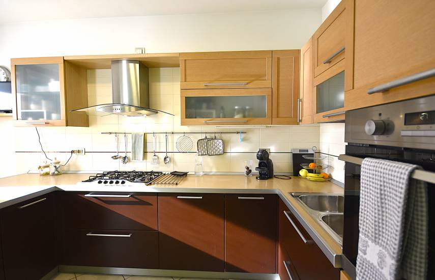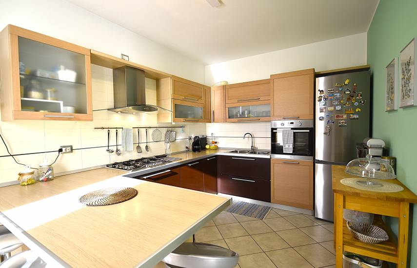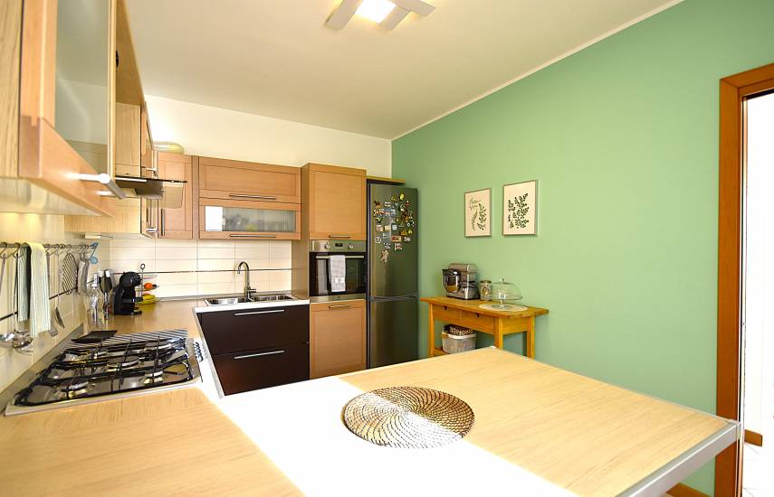 La cucina, completamente separata, si presenta ampia e ben organizzata negli spazi: la penisola laterale offre comodità e superfici di lavoro aggiuntive, mentre la parete in elegante verde salvia dona carattere, modernità e un tocco di delicatezza all’ambiente. È una cucina pensata per essere vissuta davvero, perfetta per chi ama cucinare e raccogliere la famiglia attorno al tavolo.
