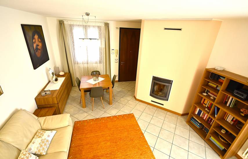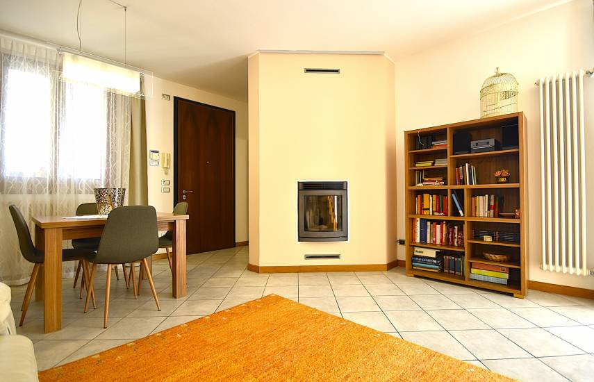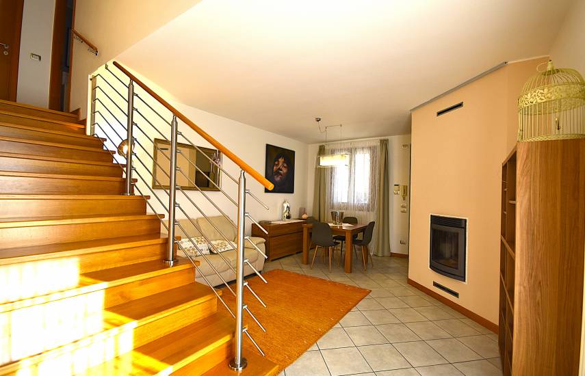 Un accogliente portico coperto introduce all’abitazione, accompagnando verso l’ingresso principale. Varcata la soglia, si viene accolti da una zona giorno luminosa, spaziosa e armoniosa, un ambiente che colpisce subito per la sua atmosfera calda e familiare. Il caminetto, perfettamente incorniciato nella parete, diventa il cuore della stanza: un elemento decorativo e allo stesso tempo funzionale, capace di rendere ogni momento più intimo e piacevole.
