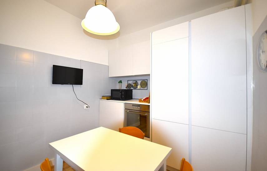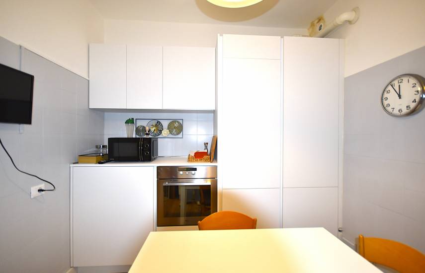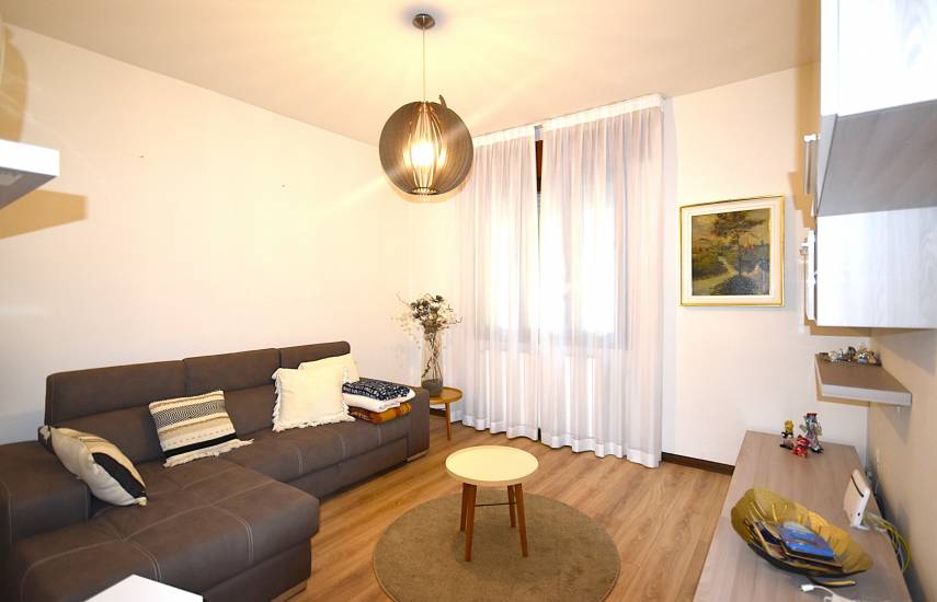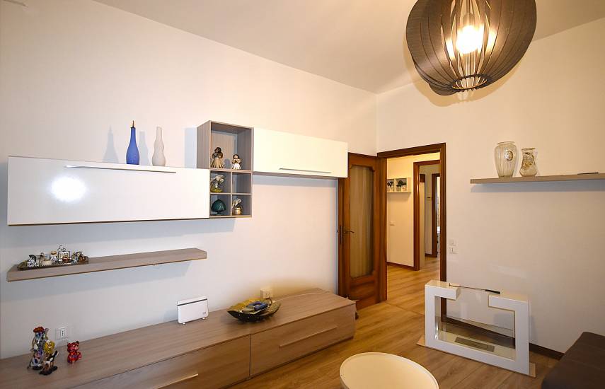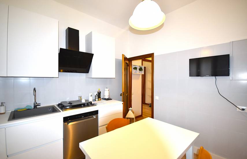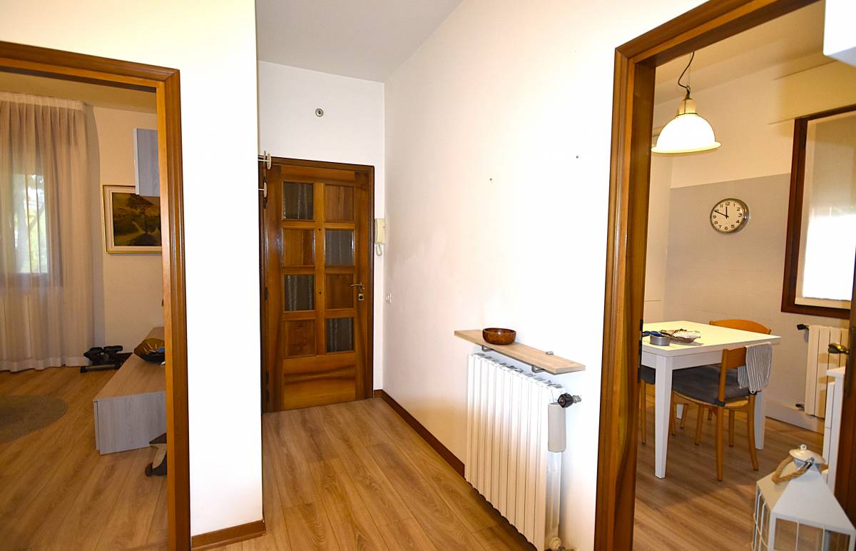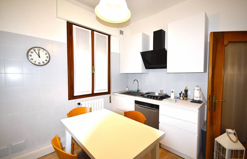 L’ingresso si apre su un disimpegno centrale che conduce da un lato a un luminoso soggiorno, perfetto per accogliere momenti di relax o convivialità, e dall’altro a una cucina abitabile separata, completamente arredata e pensata per la vita quotidiana in famiglia.